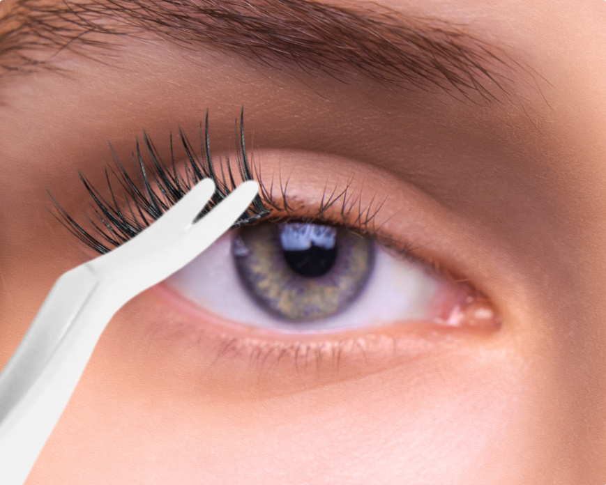 • Apply lash clusters to underside of your lashes, from the outer corner to the inner corner. Once in place, squeeze the clusters onto your natural lashes with the tweezers and hold for 5 seconds.